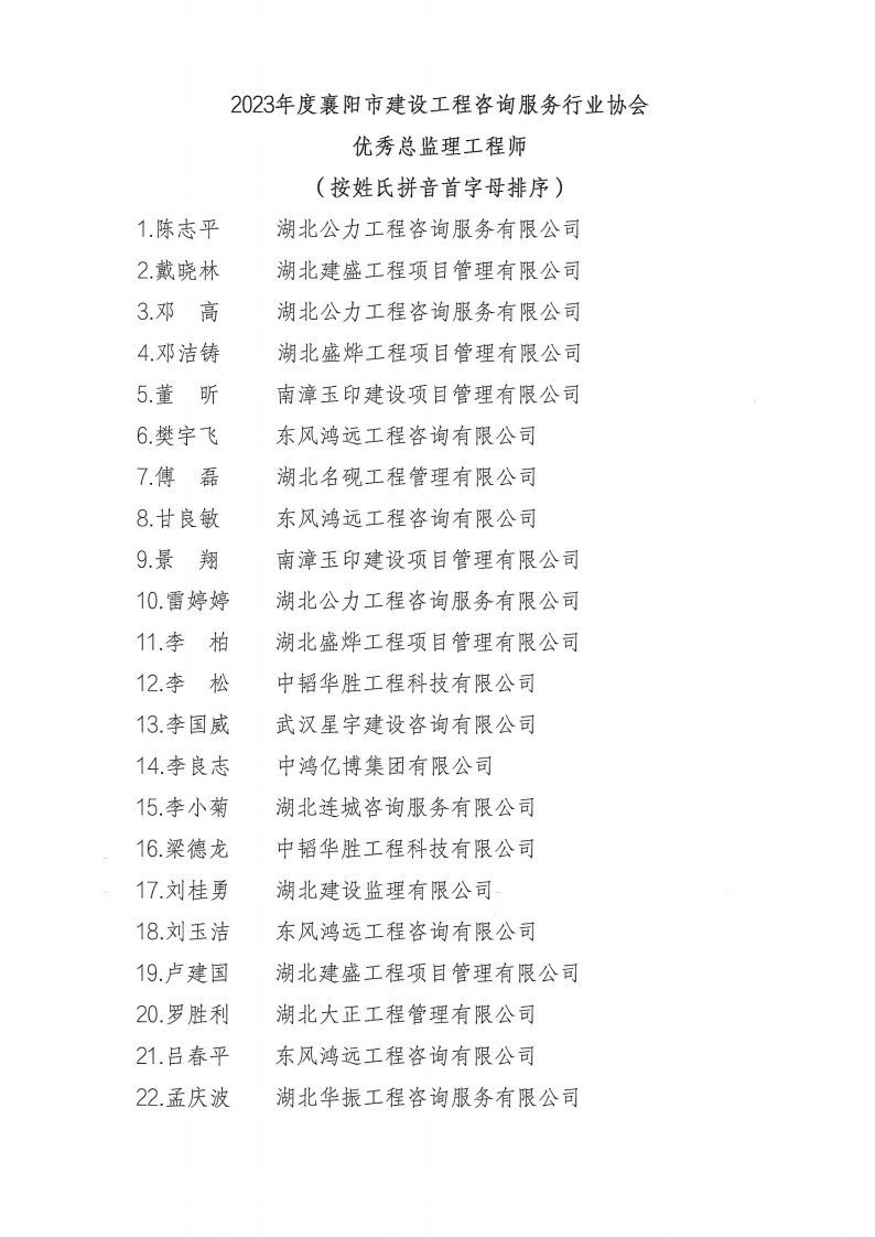 确定安徽科创工程项目管理有限公司襄阳分公司等35家企业为2023年度襄阳市建设工程咨询服务行业协会先进单位;陈志平等47名同志为2023年度襄阳市建设工程咨询服务行业协会优秀总监理工程师;邓合珍等36名同志为2023年度襄阳市建设工程咨询服务行业协会优秀造价工程师;卜雄雄等29名同志为2023年度襄阳市建设工程咨询服务行业协会优秀检测工程师;厂前区工程EPC项目、襄阳轻型商用车智能制造和绿色工厂升级项目等33个项目为2023年度襄阳市建设工程咨询服务行业协会优秀工程监理项目。