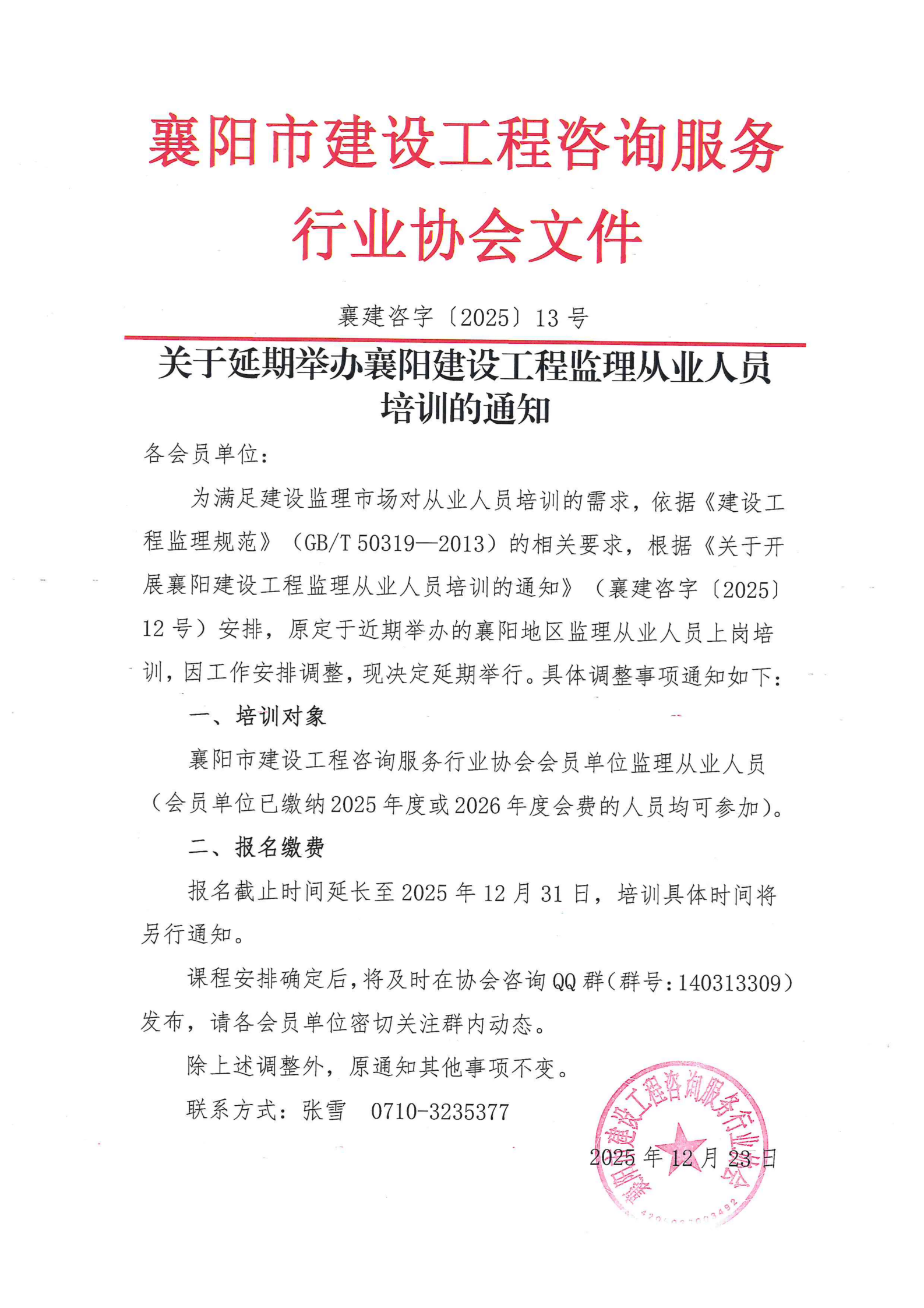 关于延期举办襄阳建设工程监理从业人员培训的通知
