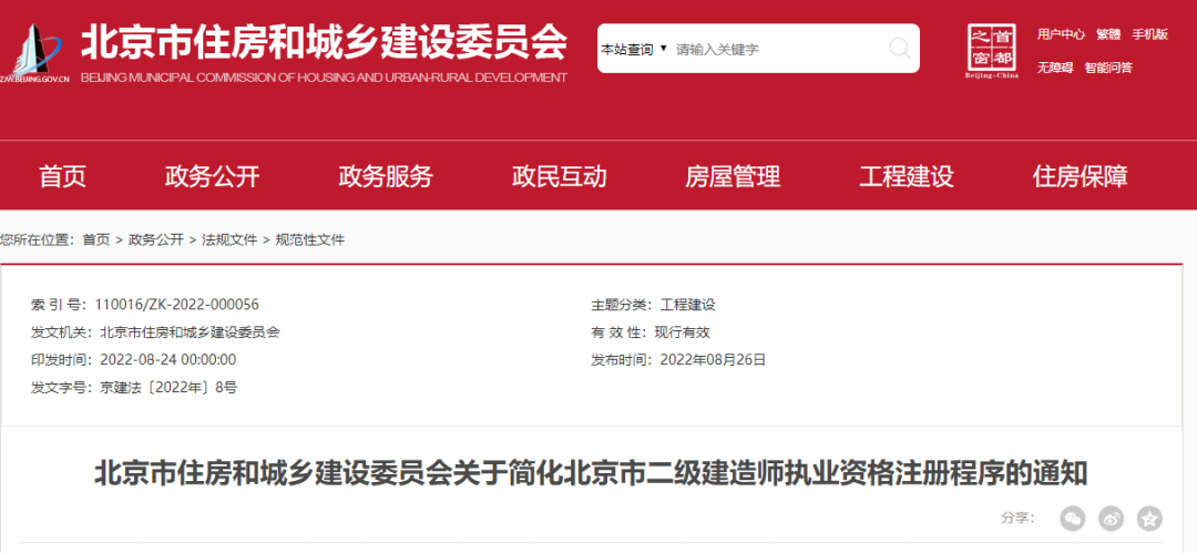 一、取消公示审核意见环节。取得北京市二级建造师执业资格证书的人员,应登录市住房城乡建设委门户网站(http://zjw.beijing.gov.cn/)网上办事大厅,完成北京市统一身份实名认证,通过北京市住房和城乡建设领域人员资格管理信息系统全程网上办理注册申请。